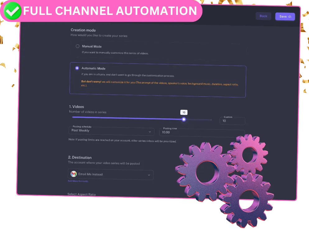 Let the AI post your videos, find trending hashtags, and optimize titles and descriptions for maximum reach automatically.