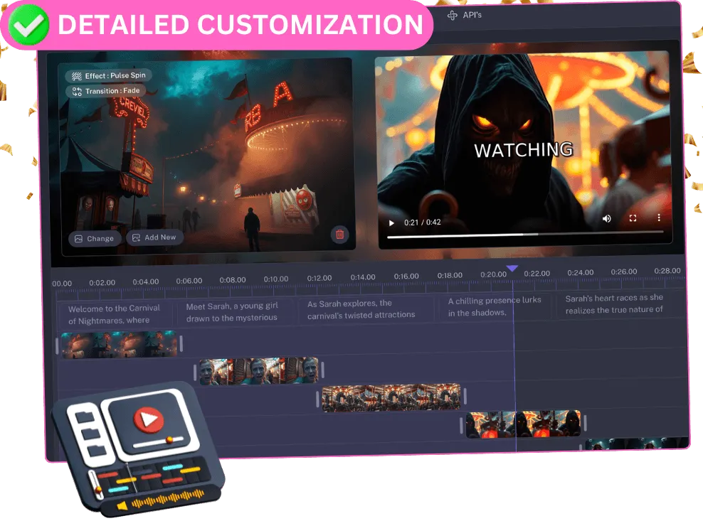 Turn simple ideas into complete videos in minutes. The AI crafts engaging storylines, adds human-like voiceovers, selects visuals, and syncs everything perfectly to keep viewers hooked.
